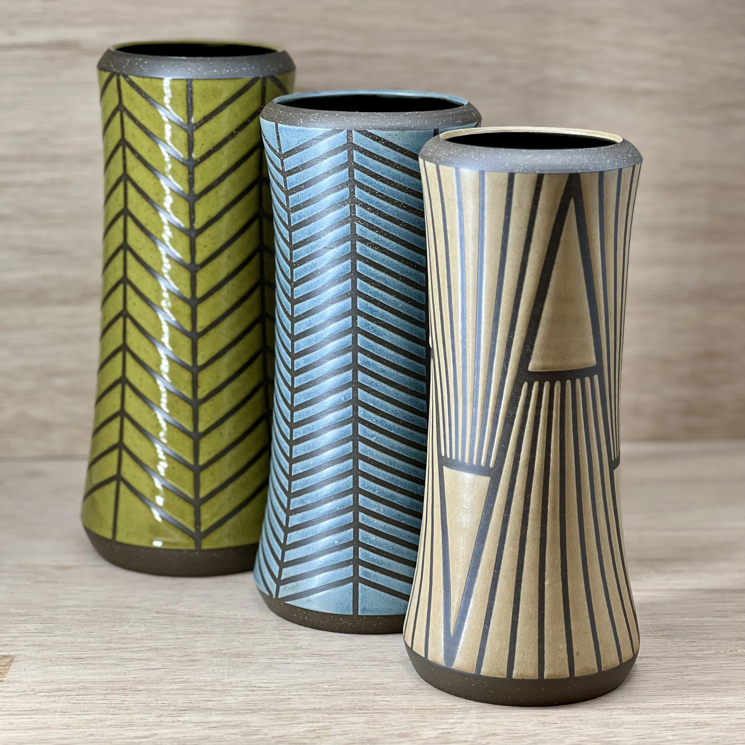 I’m a Chicago potter who throws functional and decorative work for the home and garden, drawing inspiration from mid-century forms and stained glass designs. I also love the contrast of glaze against clay body, and I explore this through a variety of tape resist lines that let the fired clay play against the surrounding glaze. — Anne Terpstra