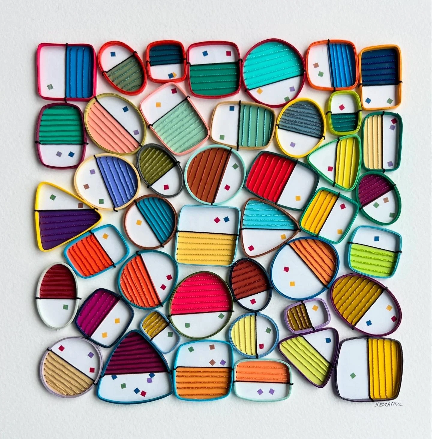 My work takes an uncommon look at everyday objects. Whimsy and nostalgia mix with shape, color and texture to draw the viewer in to closely examine my work and the daily objects around them. The rhythm of repeated lines, overlapping patterns and colors intrigues me while pursuing the subtle balance of playfulness and precision. — Judy Zeddies